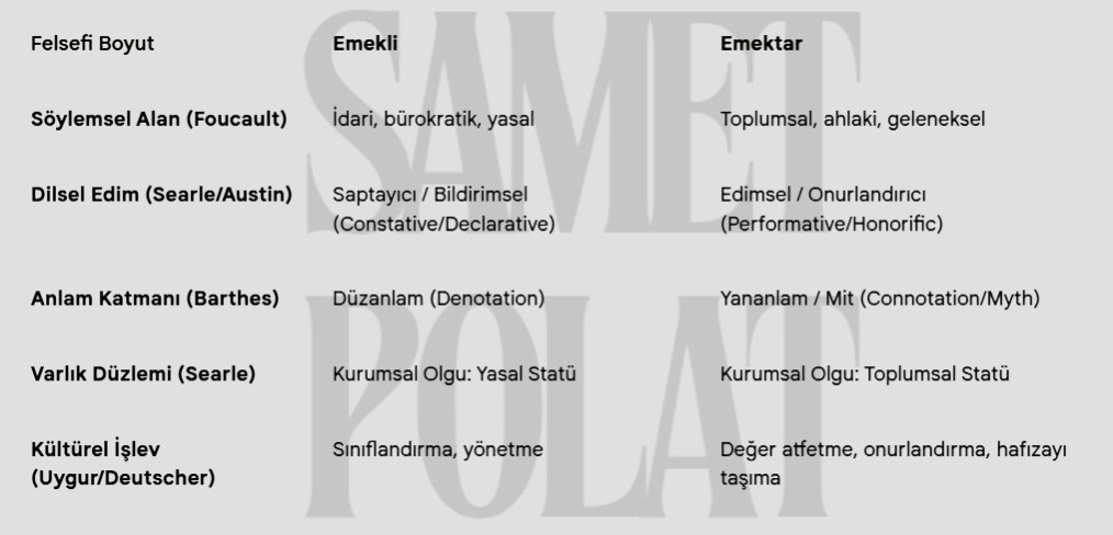 “Emektar” ise yananlamların zenginliğiyle yüklüdür. Bu kelime kişinin sadece çalışmayı bıraktığını değil, o süreçte biriktirdiği “emek” (Marksist bağlamda üretken güç diyebiliriz) üzerinden bir değer kazandığını ifade eder. Barthes’ın “mit” kavramı burada devreye girer; toplum, “uzun süre çalışma” olgusunu alıp onu “tecrübe, bilgelik, saygıdeğerlik” gibi pozitif değerlerle donatır ve yeni bir anlam katmanı yaratır. Barthes’a göre mit, “kültürü doğaya ya da en azından toplumsal olanı, kültürel olanı, ideolojik olanı, tarihsel olanı ‘doğal olan’a çevirmekten oluşur” (Barthes, s. 80). “Emektar” kelimesi bu kültürel mitin taşıyıcısıdır. Dolayısıyla bu kelimeyi seçmek sadece bir durumu tespit etmekle kalmayıp bir değer yargısını ve bir kültürel kodu da devreye alır.