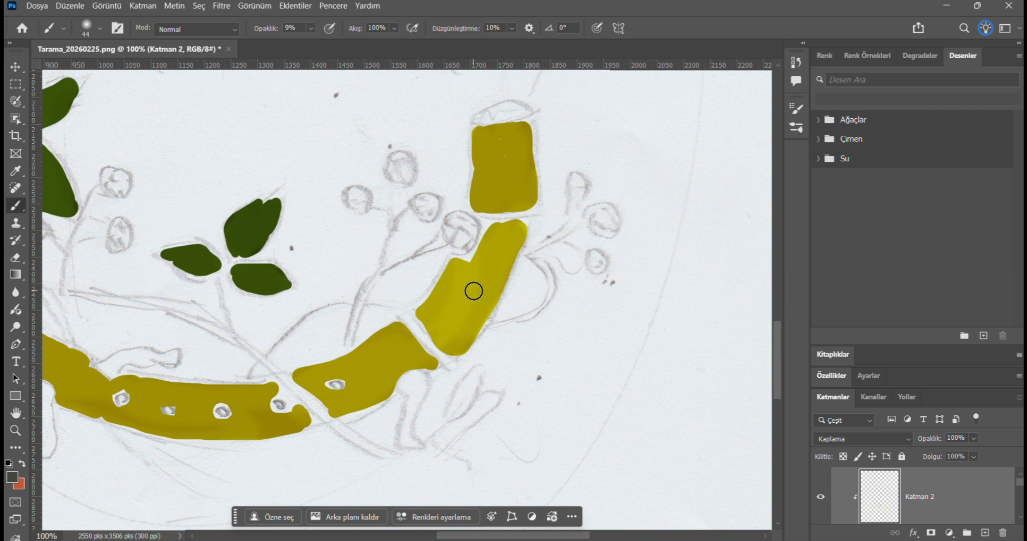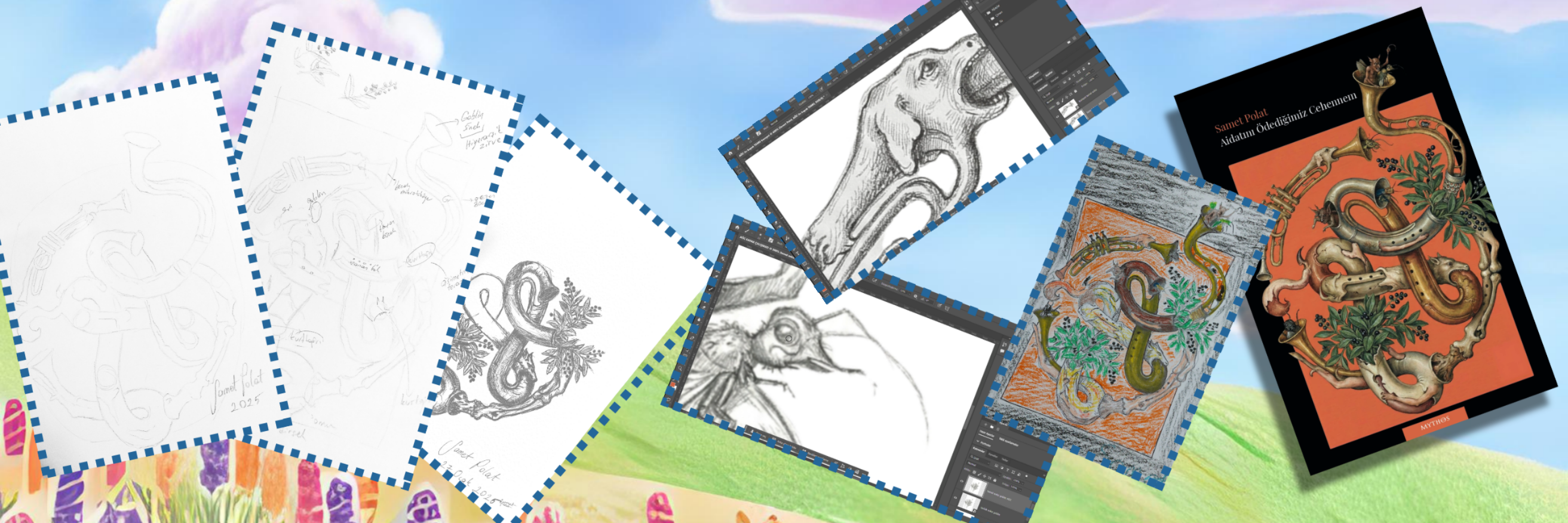 Arka Kapak Görsel Kurgusu: Orijinal Karakalem EskizArka Kapak Dijitalizasyon Süreci: Taranmış Eskiz Üzerinde Manuel Renk Bloklama Aşaması