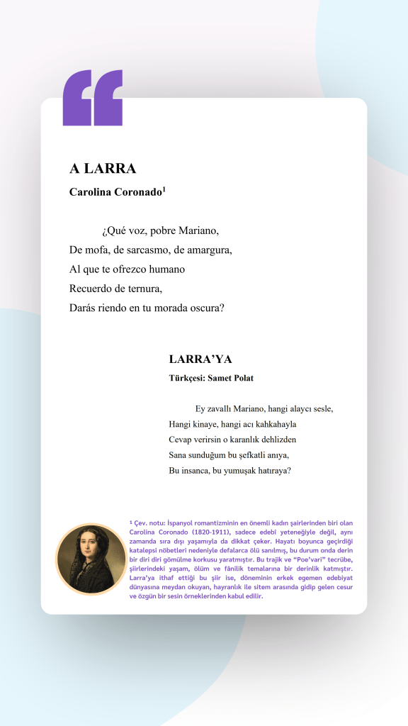 “Ama artık sakının gözden. O hâlde! Ey haset ruhlar, kulağın yerini tırnakla nöbet tutarak… Ben ki kepazeliğin suratına en tiz perdeden ıslık çalan, Yere ve alçaklığa eğilirsem o, Vaftiz edebilir beni salyasıyla.”